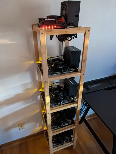 Finished building and setting up my 4 3900 builds, read my previous post for more details. Figuring out the best way to build them into the shelf was a lot of trial and error, especially with cable management. Took a few hours, but I’m glad it worked out in the end. I was satisfied with my undervolt on the first rig, but unfortunately I was not able to transfer it to the second. I ended up just using dcop and keeping all the cpus stock for uniformity instead of individually overclocking all the machines. Right now they’re doing 12.2-12.4kh/s at 80-84c which is making the room quite toasty, should be nice in the winter (not so much in the summer). Would ROI in about 3 years at the current rate. The top machine is a 5600x which I use as a home server, running monerod and p2pool. I used to run nixos but I eventually switched back to alpine like the other 5 machines. Currently using docker-compose and nixery.