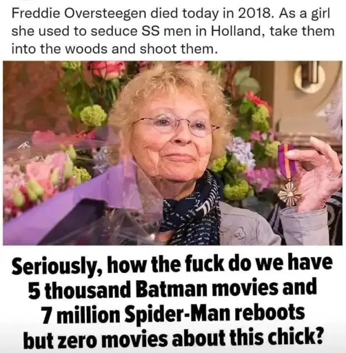 Because the superhero movies are thinly veiled propaganda for billionaire exceptionalism. Empowering the average person is disruptive to your peasant caste you’re not allowed to talk about openly. It is such an engrained cultural taboo you can’t even register what I am saying as real, despite it being so obvious that there are classes of people completely disassociated with life as you know and live it. The only exceptional people are the exceptionally greedy and exceptionally unethical. Ms. Oversteegen is a hero like Luigi, someone that stands above our station in life. Such stories are not told or popularized much at all.