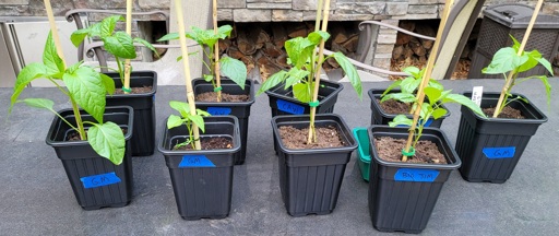 My “Big Jim” hatch chile plant isn’t looking very big yet. The Guizeppi Milds and California Wonders are doing a bit better. This was the first day I took them all outside for a few hours to start the hardening off process. I’ve had them inside with a fan and grow lights up until now.