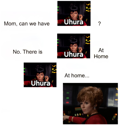 I never considered it before, but Uhura is the only bridge crew who never seems to have an off-shift. She’s always there, when Kirk comes back from working out, when Sulu gets relieved for a shift change.