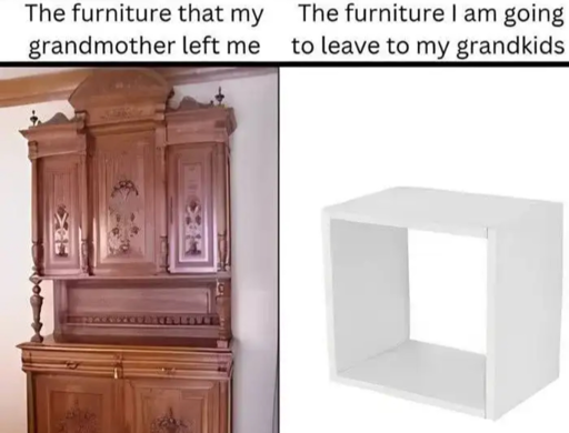 Lots of old people still offload hardwood furniture on kijiji (local buy&sell) or ReStore (2nd hand warehouse here) here it’s not expensive to aquire if you happen to like orange and brown furniture. Or can stand to put some time in refinishing stuff or even repairing the more worn pieces that sell for even less.