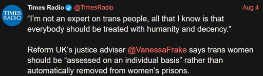 They’re not. Farage was out hours after clarify that he didn’t want “Men in women’s prisons”.