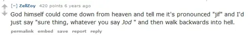 If enough people think gif should be pronounced like “god”, then it should. If the “jif” pronunciation has enough people who use it, then that’s valid, too. Hell, if a bunch of people started legitimately saying it should be a homonym with the word “plankton,” even that’d be valid.