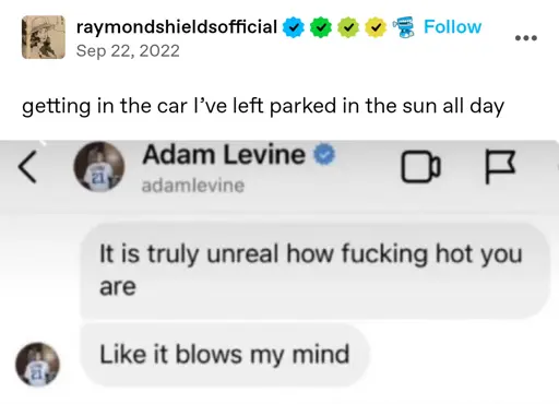 Adam Levine deserves to have his scrote melded with plasmatic vinyl seating. 🤷🏼♂️