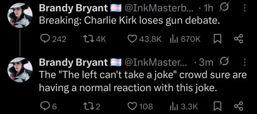 Though when right-wingers assassinated those Minnesota democrats some months back, or when Pelosi’s husband got beaten nearly to death in his own home, Kirk and Trump, and other figureheads, as well as a flood of nobody right-wingers on social media who are all now up in arms and angry about Kirk’s death, just got smug and cheered and jeered about it. So, thoughts and prayers for dickhead and the family he leaves behind, and I guess we just wait and see what comes next in this little circus of bullshit.