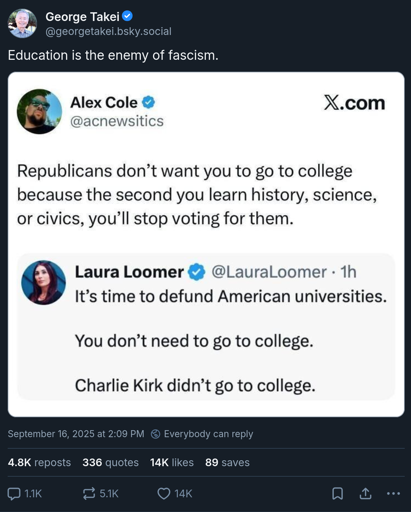 Why is the bottom tweet acting like Charlie Kirk was some paragon of intelligence? Ah yes, we must defend colleges because this random guy didn’t go to one.