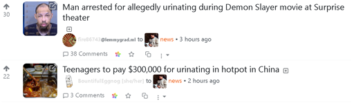 Angel [any]@hexbear.net to badposting@hexbear.net · 17 days agoIf I had two nickels for every post about pissing crimes on Hexbear's front page today, I'd have 2 nickelshexbear.netimagemessage-square6linkfedilinkarrow-up151arrow-down10file-text