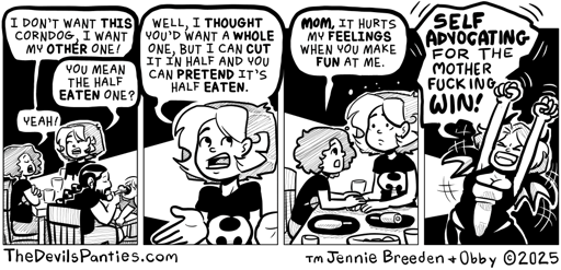 Ok I understand this but I don’t. Did the kid drop a half eaten one on the floor and she threw it out??? The rollover calls it sarcasm which im not sure it would be if it were me. I might have immediately cut one in half as sometimes kids find that type of solution fine. Guess it depends on kid and age. Many of her recents with the older kid seems to be about her cognition reaching new levels.