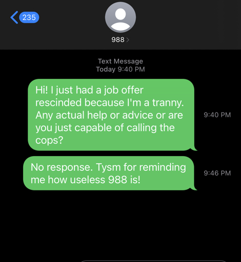 themutedtrumpet@slrpnk.net to Mental Health@lemmy.worldEnglish · 26 days ago988 is uselessslrpnk.netimagemessage-square4linkfedilinkarrow-up19arrow-down135