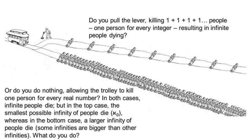 I pull the lever, if the cart goes over the real numbers it will instantly kill an infinite amount of people and continue killing an infinite amount of people for every moment for the rest of existence.