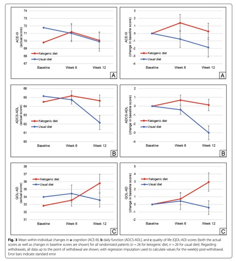 Results - We randomized 26 patients, of whom 21 (81%) completed the ketogenic diet; only one withdrawal was attributed to the ketogenic diet. While on the ketogenic diet, patients achieved sustained physiological ketosis (12-week mean beta-hydroxybutyrate level: 0.95 ± 0.34 mmol/L). Compared with usual diet, patients on the ketogenic diet increased their mean within-individual ADCS-ADL (+ 3.13 ± 5.01 points, P = 0.0067) and QOL-AD (+ 3.37 ± 6.86 points, P = 0.023) scores; the ACE-III also increased, but not significantly (+ 2.12 ± 8.70 points, P = 0.24). Changes in cardiovascular risk factors were mostly favourable, and adverse effects were mild.