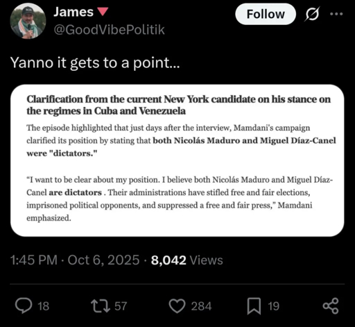 Edit 2: My position is that there are some positions, though correct, are positions that a US politician simply cannot take in public. I don’t like it but I accept it. Talking positively about Stalin, for example. Zohran’s comments about Oct 7 were right on that edge, IMO. But shitting on Cuba, come on. Cuba is like one of the safest ones to support. And shitting on Maduro is actively harmful rn