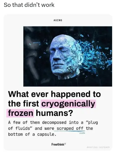 minus-squareBennyboybumberchums@lemmy.worldlinkfedilinkarrow-up7·2 days agoRich cunt: “Im going to live forever!!!” 20 years later… Poor cunt, scraping the rich cunts decomposing oozey brain matter off the bottom of the capsule:
