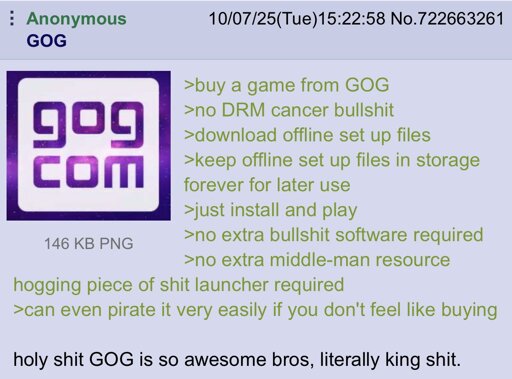 That’s an odd thing to get hung up on. I buy more from Steam because the client is way nicer on Linux and they actually release interesting features for it. I could buy from GOG through Heroic, but they why should I expect them to properly support me on Linux when they don’t even bother to explicitly support Heroic (they do profit share, but that’s not quite the same), much less port Galaxy?