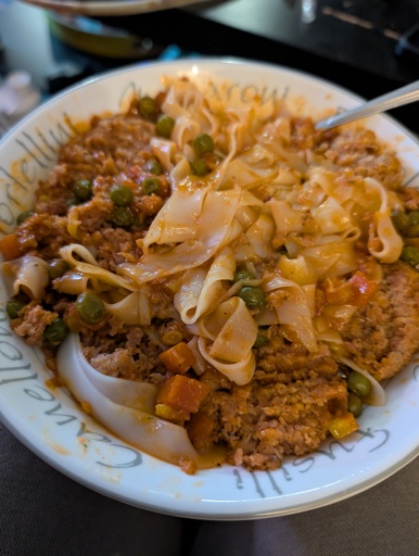 Yesterday’s tteokbokki were extra saucy so I decided to use the leftover sauce and veg with some thicc rice noodles and commercial tvp balls.