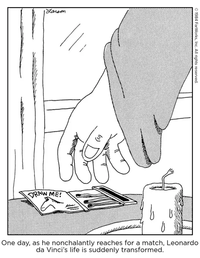 These match books have card matches so they are difficult to strike like a wooden match. The card match is drawn through between the cover of the matchbook and the striking surface. So the ad on the front of the packet is a word play on the igniting mechanism. Larson’s joke here seems to be that MichaelangeloDa Vinci , one of history’s most famous artists, was inspired to become an artist by one of these everyday matchbook puns.It says Leonardo da Vinci pretty clearly lmao