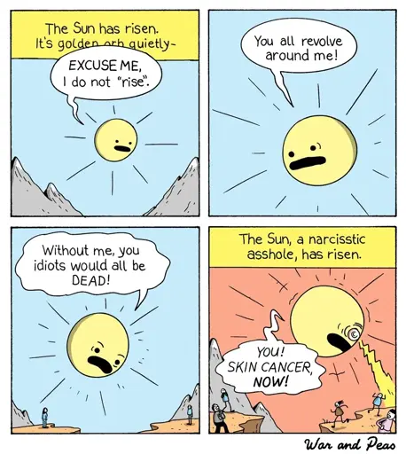 Ha, the sun thinks that we think it rises because we revolve around it rather than rotating on our own axis. Stupid asshole sun.