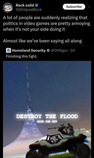 Also this isn’t “politics in games” it’s the white house using copyrighted IP for memes. Real life isn’t halo!