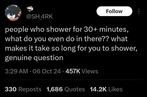 Stamets@lemmy.dbzer0.com to People Twitter@sh.itjust.works · 22 days agoI can undress, shower, dry and dress in less than 10. WHAT ARE YOU DOINGlemmy.dbzer0.comimagemessage-square228linkfedilinkarrow-up1316arrow-down121