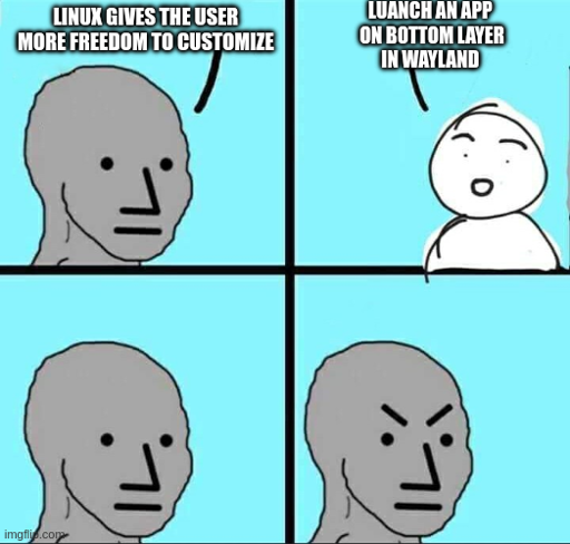 Why so salty? I am making an app that I want to stick on the background, and would like it to be cross-platform. I mean, there should be some way to achieve something this basic right? Also, Wayland is going to become the default, and most distros will switch to it.
