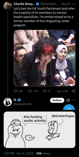 Just watched through the latest UK youth parliament session, they seem to be Member from Essex, and they talked about the cost of the environment and how money doesn’t get us shit, great shit! https://www.youtube.com/live/5qnNCoiYmKE?t=7838