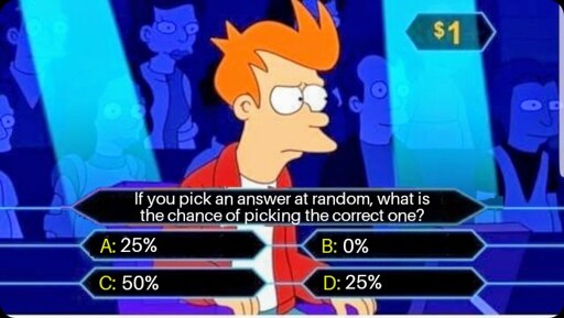 As you say, the question presented to Fry doesn’t mention a question at all. Only an answer. So, you could make an argument that any answer could be the answer to something, and therefore you’d have to choose a 100% chance, which isn’t an option.