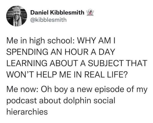 My biggest pet pieve about the sentiment that it’s a waste of time to learn things you won’t use, is that many things people complain about they ought to be able to use, or at least it helps them form an understanding that helps them learn other things in the future.
