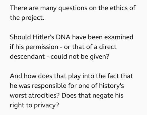 Also he’s dead, why do dead people deserve anything, any rights? What harm happens to Hitler? He’s dead. Did we ask dinosaurs to look at their DNA, for all we know they were sentient? The whole argument is stupid.
