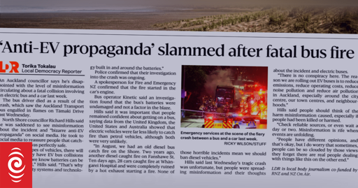 He cited New Zealand Herald and RNZ’s Checkpoint coverage of the Fairview community’s dilemma as failing to make clear that EVs pose a much lower fire risk than combustion engine vehicles.