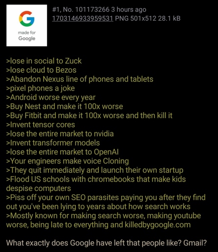 I mean, a lot of the points are valid, but the Pixel phones are pretty great, Android is pretty great and getting better, and the Chromebook gamble is playing a really long term game where they could end up uprooting Microsoft if they play their cards right. From my understanding, US kids now on average know Chromebook OS better than Windows by far, and will probably prefer to continue using it if they could. If Google makes the OS more viable for professional use and flexible and play their cards right, they’d have a really good chance at uppending Microsoft’s dominance, especially since Microsoft is seemingly trying to shoot itself in the foot with Windows.