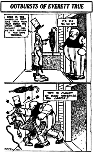 Old Nobody is the character of another comic from the same time period, by Clifton Meek. Meek apparently ghost-wrote a few Everett True comics as well. It seems like Nobody’s gimmick started off with more or less the exact same first panel as Everett comics, but Nobody’s thing would be that he would never actually challenge the problem because he’s “nobody”