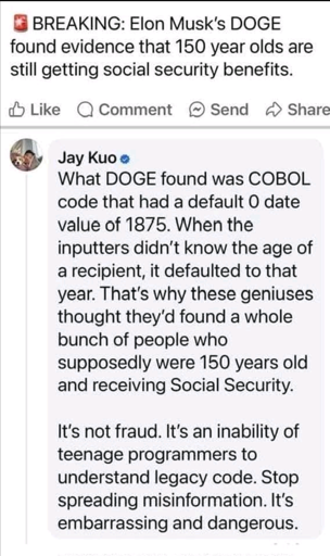 DytallixB@lemmy.world to Enough Musk Spam@lemmy.world · 7 months agoWhy 150 years olds are still getting social security benefitslemmy.worldimagemessage-square180linkfedilinkarrow-up11.77Karrow-down119