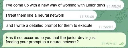 arrow-up1759arrow-down1imageJunior Prompt Engineeringlemmy.mlcm0002@lemmy.world to Programmer Humor@programming.dev · 7 months agomessage-square54linkfedilinkcross-posted to: programmerhumor@lemmy.ml