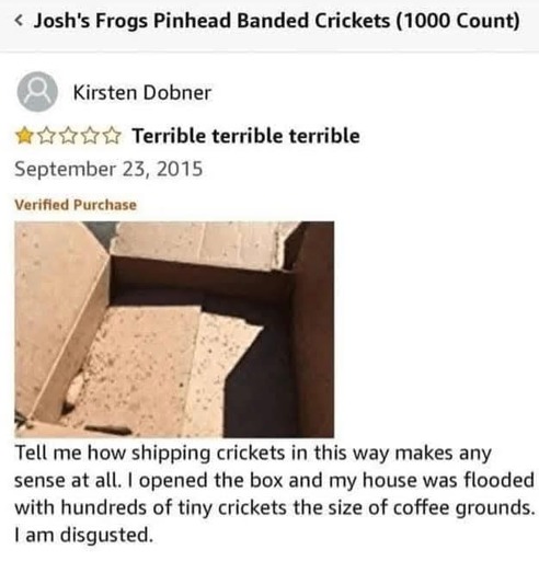 What is funny is that is how you are suppose to ship crickets and anyone who has bought large amounts of crickets knows that.