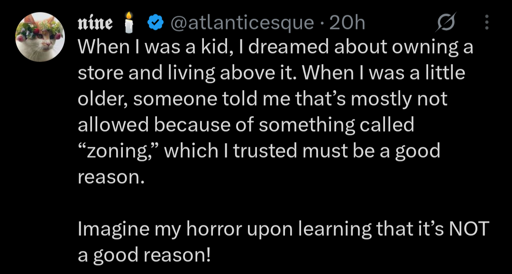 Ok, now it’s driving me nuts figuring this out. I live in Oklahoma and yeah, minus some small exceptions, our commercial and res are strictly zoned, and maybe this applies to other places where the strip mall and Plaza are king, and there’s more room in general? Our ‘town squares’ are nothing but beauracratic stuff, bars, and historical buildings.